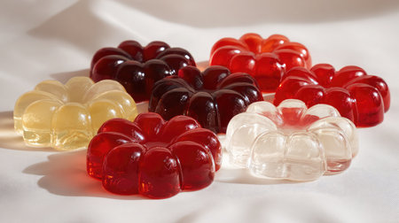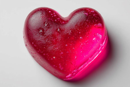 Heart-shaped jelly in vibrant pink color gleams on the smooth white backdrop, tempting sweetness.