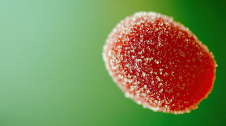 A vibrant red gummy candy is highlighted, showing its sugar coating, against a smooth green backdrop.