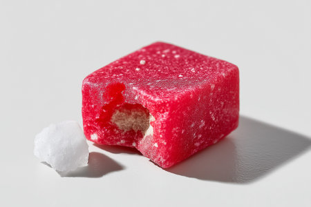 Bright red gummy candy captured in closeup with a bite taken out revealing soft interior. Clean white background emphasizes details. Concept of confectionery, sweets, snacking.