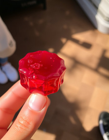 Hand holding a red jelly in the form of an ice cube.