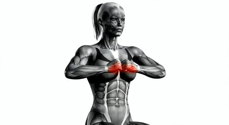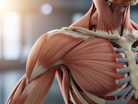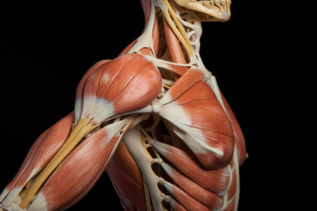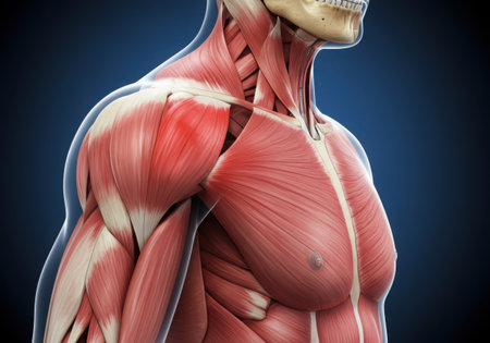 Detailed anatomical illustration highlighting human muscles in the upper body, ideal for educational and informational purposes in health, fitness, and biology.