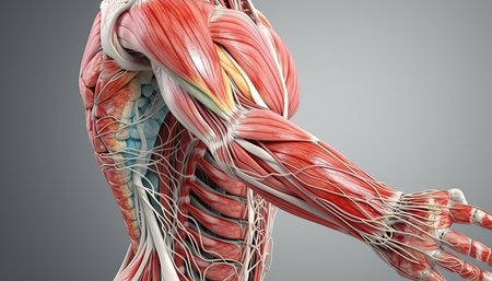 Detailed anatomical model showing the muscular structure of the human arm and upper back, highlighting muscle fibers and tendons.