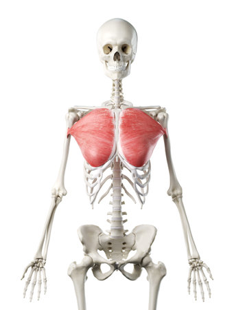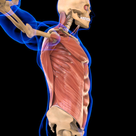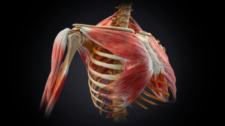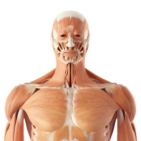Anatomical Illustration of Human Musculature Focused on Upper Body Structure with Detailed Rendering of Muscles and Bones