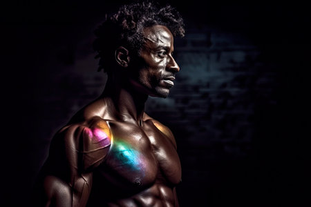Muscular shirtless man with skin painted with Holi colors. Ai generated.