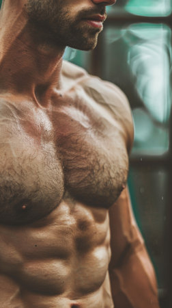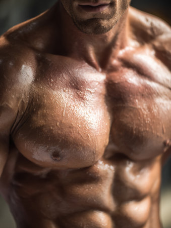Close-up of a muscular male torso glistening with sweat during an intense workout.