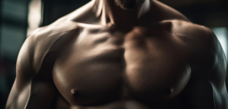 Muscular torso of a bodybuilder shines with oil in a dimly lit gym, showcasing defined muscles and intense focus during a training routine.