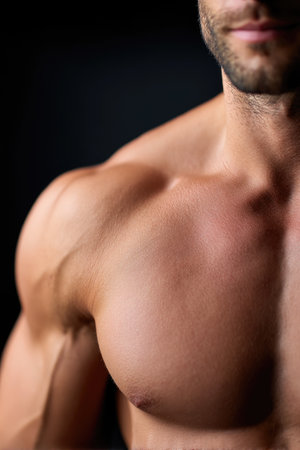 Man, closeup and muscle in studio, shirtless and skin for chest or strong pectoral for fitness. Male person, body and bodybuilder for health, flexing and athlete for topless wellness in dark
