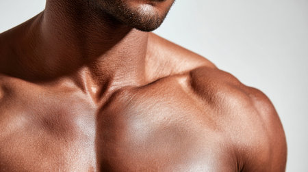 A powerful, sculpted male physique displayed with flawless skin and subtle shadows highlighting chiseled pectorals and rounded deltoids against a simple backdrop.