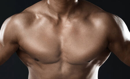 Cropped image of handsome muscular man with bare torso showing muscles, on dark background