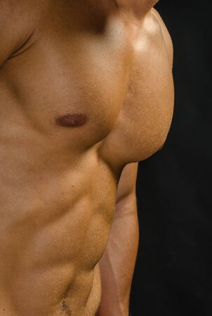 Male muscular sensual strong naked torso with cool abs and pectorals on belly of sporting bodybuilder boy closeup on dark background black and white, horizontal picture