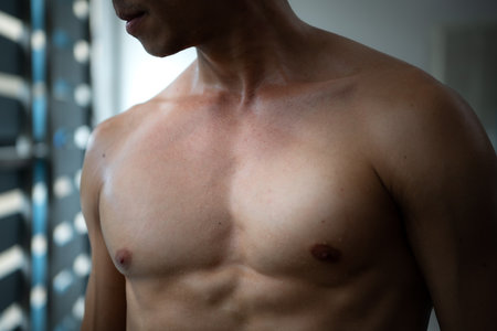 Close-up view of a muscular torso glistening with oil, highlighting well-defined abs and pecs in a dimly lit gym environment.