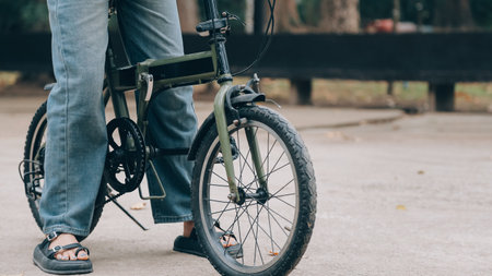 Happy young woman with bicycle relaxing in the park. Close view on legs. Autumn and sport time relax concept.