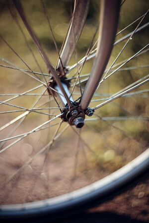Forward wheel of the bicycle close up with bokeh
