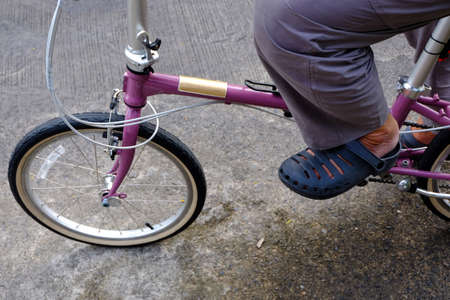 Person riding a bicycle in a low angle view of the foot and wheel.