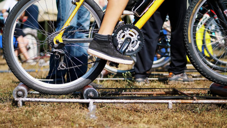 close-up, the wheels of an old exercise bike, the bike rides in one place with the help of a special self-made fixture, installation. High quality photo
