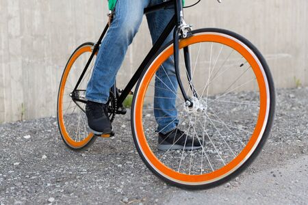people, travel, tourism, transport and lifestyle - close up of young hipster man with fixed gear bike on city street