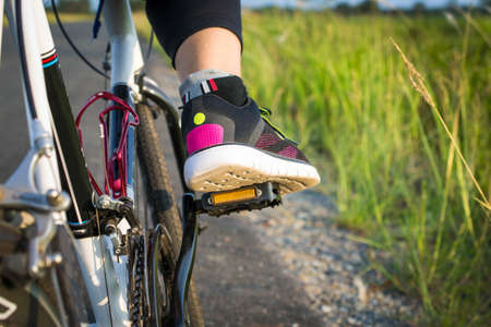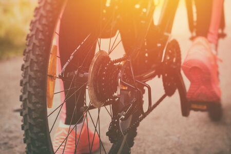 Woman riding a mountain bicycle along path at the forest. Closeup on pedal and foot. Healthy lifestyle and sport concept