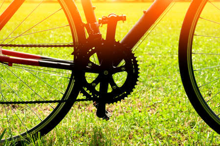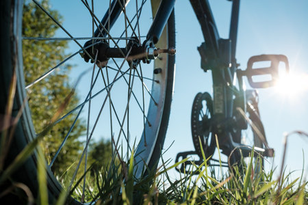 Close-up detail of a bicycle parked in a meadow, against the backdrop of the sun and blue sky. Active lifestyle concept. Bottom view.