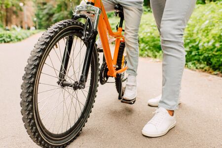 Rear view of the legs and bike of an unrecognizable teenager. Bicycling. Healthy lifestyle concept