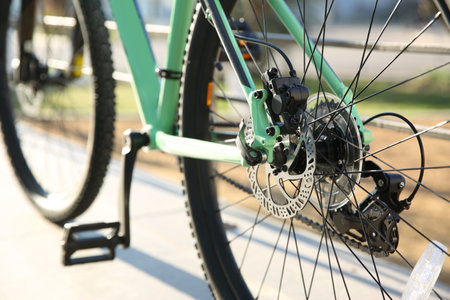 Modern green bicycle on city street, closeup