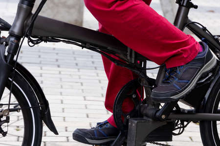 legs of person with red pants and black shoes with blue pedaling electric bicycle