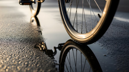 A close-up view of a bicycle wheel on wet asphalt captures a clear reflection in a puddle during the golden hour. The low-angle shot highlights the tire tread and spokes against the urban street texture.