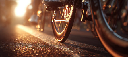 Close-up of Cyclists Wheels Spinning on Sunlit Asphalt in Warm Tones
