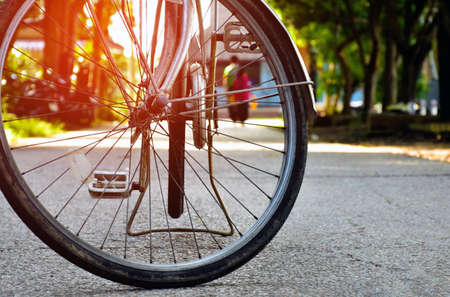 Bike at the summer sunset on the tiled road in the city park. Cycle closeup wheel on blurred summer background. Cycling down the street to work at summer sunset. Bicycle and ecology lifestyle concept.