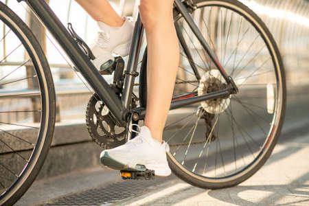 Legs of a woman in sneakers with a bicycle close up