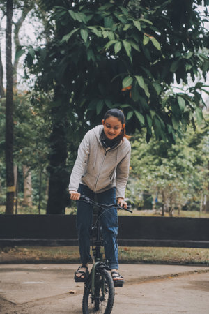 Woman riding a bike on tropical park trail in spring