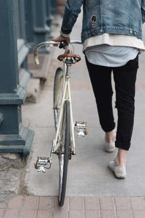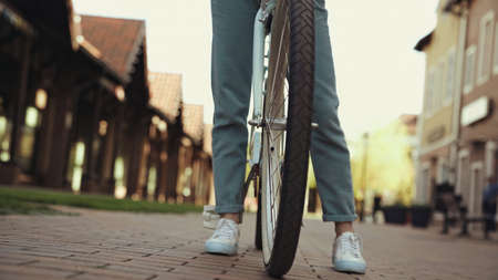 Legs of a woman in sneakers with a bicycle close up