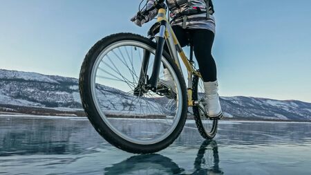 Woman is riding bicycle on the ice. Girl is dressed in a silvery down jacket, cycling backpack and helmet. Ice of the frozen Lake Baikal. Tires on bike are covered with spikes. Traveler is ride cycle.