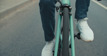 POV of pedaling male legs. Man cycling along city bike path