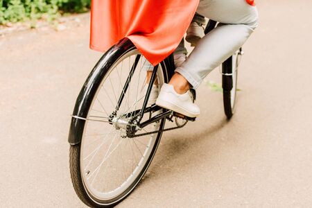 cropped view of young woman in jeans riding on bicycle outside