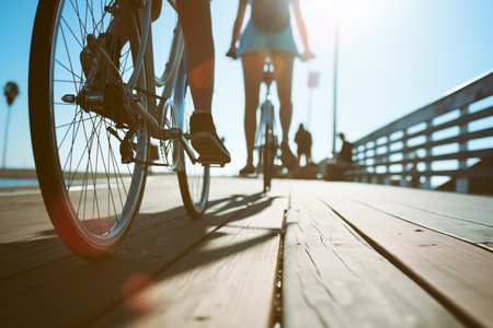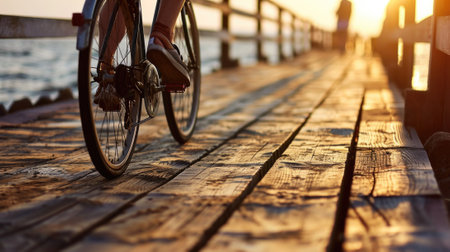 Cyclist Riding on Boardwalk in Sunlight, Rear View, Morning Exercise and Recreation.