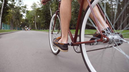 Male cyclist in white cycling shoes and socks rides bicycle. Bike wheel rotation