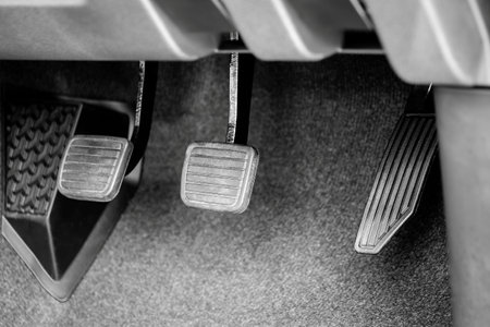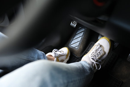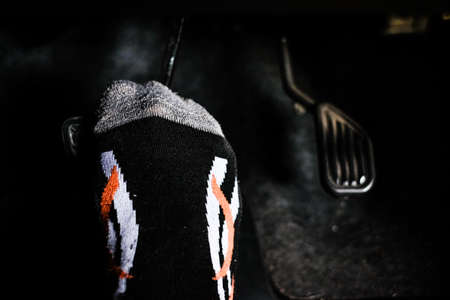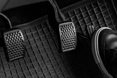 Foot pressing foot pedal of a car to drive. Accelerator and brake pedal in a car. Driver driving the car by pushing accelerator and break pedals of the car. inside vehicle. control pedal. Close up.