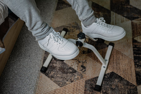 Legs of a little boy playing electronic drums, pedalling. He is wearing jeans and new stylish sneakers. Side view.