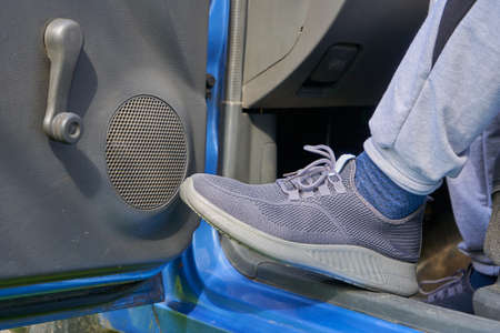 Driver foot on gas pedal of car close up photo. Car travel concept.