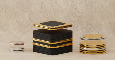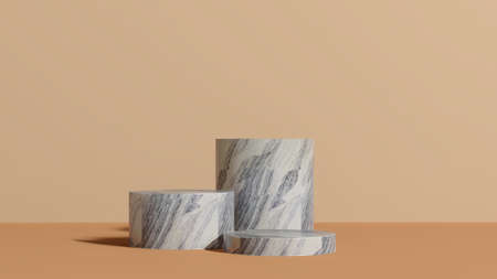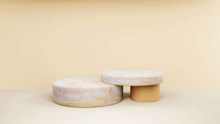 Empty background of a shelf for products. Empty podium or pedestal on a light beige marble background concept shape multi-layer cylinder coin for business and finance. 3D rendering.
