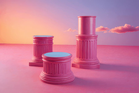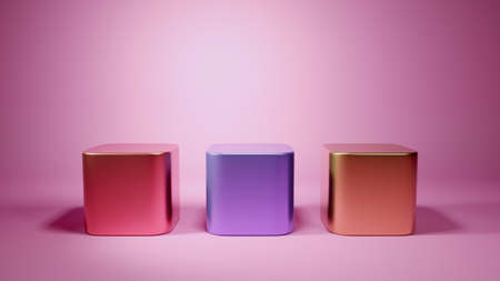 3D illustration of a 3 metallic pedestals on a gentle pink background