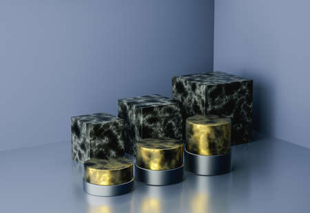 Marble pedestals or podiums with golden frames and decor 3d rendering