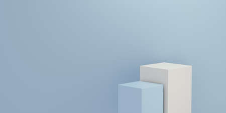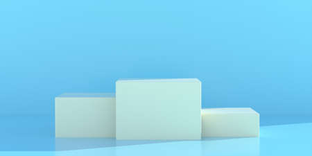 Winners podium empty. Stands set for presentation, Product display white cubes on blue color background. Stage pedestal, showcase for advertise. 3d illustration.
