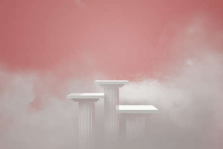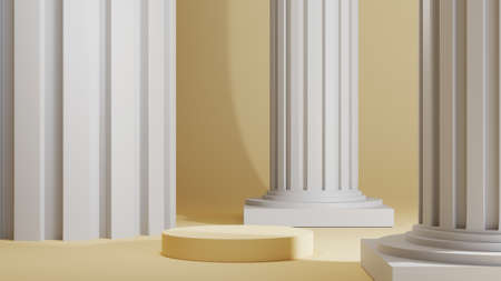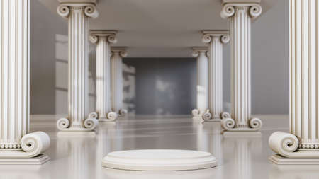 3D rendering of Light brown podium for displaying products in a room decorated with Greek columns background. Mockup for show product.