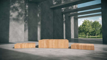 wooden podium for products show in concrete hallway with park background.3D rendering.