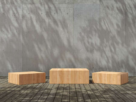 Wooden pedestal for display,Platform for design,Blank product,concrete room with Tree shadow on the wall .3D rendering.