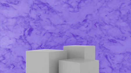 Three empty gray stands and abstract Purple Marble geometry background. Podium, pedestal, platform for cosmetic product presentation, showcase. Minimalist mock up scene, concept template. 3d rendering