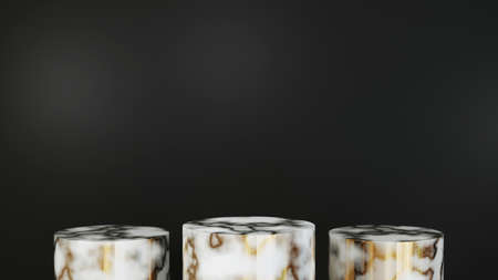 3D rendering of Marble podium for displaying three products on a black screen background. Mockup for show product.