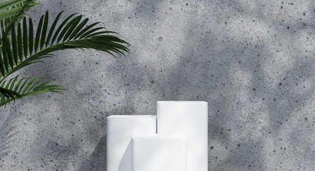 White square podiums in sunlight with shadow palm leaf in white space. Tropical showcase for cosmetic products, goods, shoes, bags, watches.