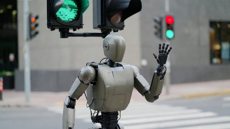 A robot in front of a traffic light.